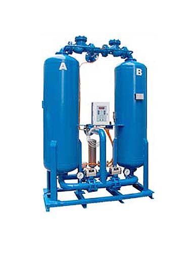 无热再生吸附式干燥机由装满吸附剂(活性氧化铝或分子筛)的两个双联机筒组成;压缩空气定时在两个机筒中轮流进行吸附和再生运行,从而使压缩空气能持续接触 到干燥的吸附剂。一小部分气流通过减压阀进入再生机筒;使已吸附水份的吸附剂干燥再生,并将水份和杂质排放到大气中。
