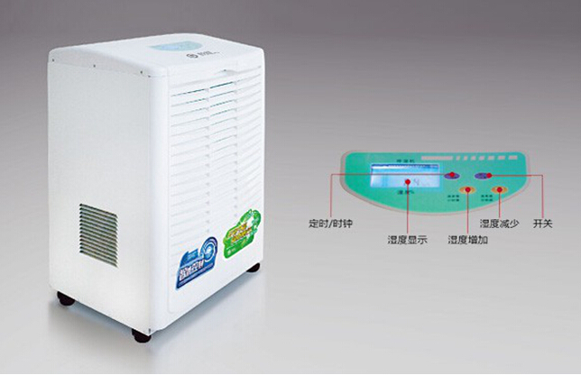 本产品属冷冻式除湿机,整机有压缩机、热交换器、风扇、机壳及控制器组成,其工作原理是:由风扇将潮湿空气抽入机内,经过制冷系统(压缩机,蒸发器,冷凝器)相互作用下凝结成霜,系统自动升温化霜成水流入盛水箱,产生出干燥空气排出,如此循环使室内湿度降低,潮湿空间逐步达到干爽的效果。